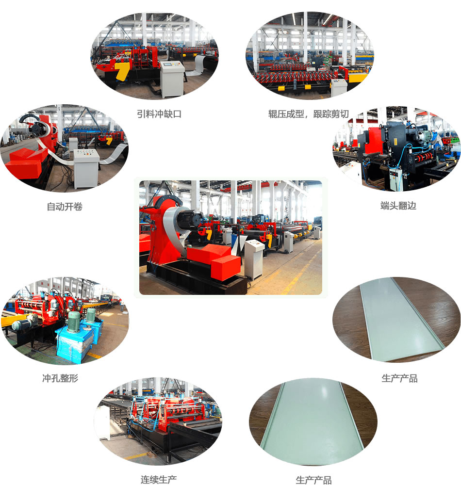 工藝流程: 自動(dòng)開卷→引料、沖缺口,剪切→輥壓成型、跟蹤切斷→動(dòng)力輸送→前后端翻邊→沖孔整形