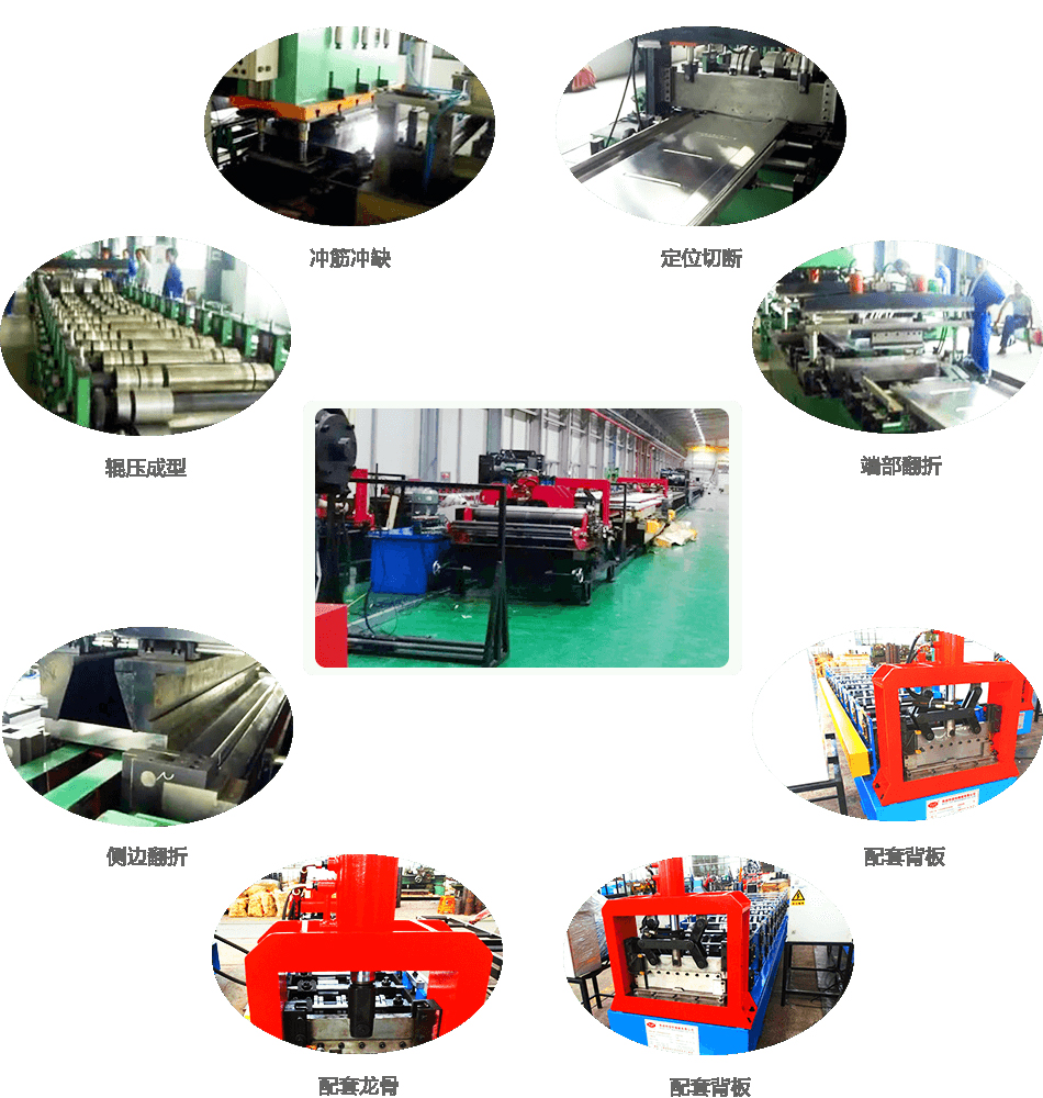 工藝流程: 開卷—引料校平—沖孔沖缺—輥壓成型—定位切斷—端部翻折—側(cè)邊翻折—托板出料
